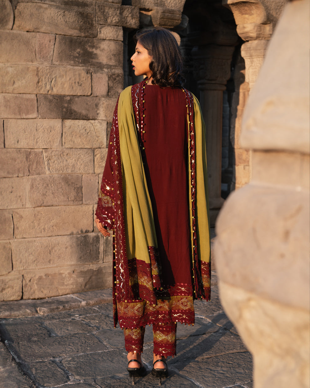 This beautiful mehendi green and rust brown valima suit with dupatta,perfect outfit for mehendi functions.