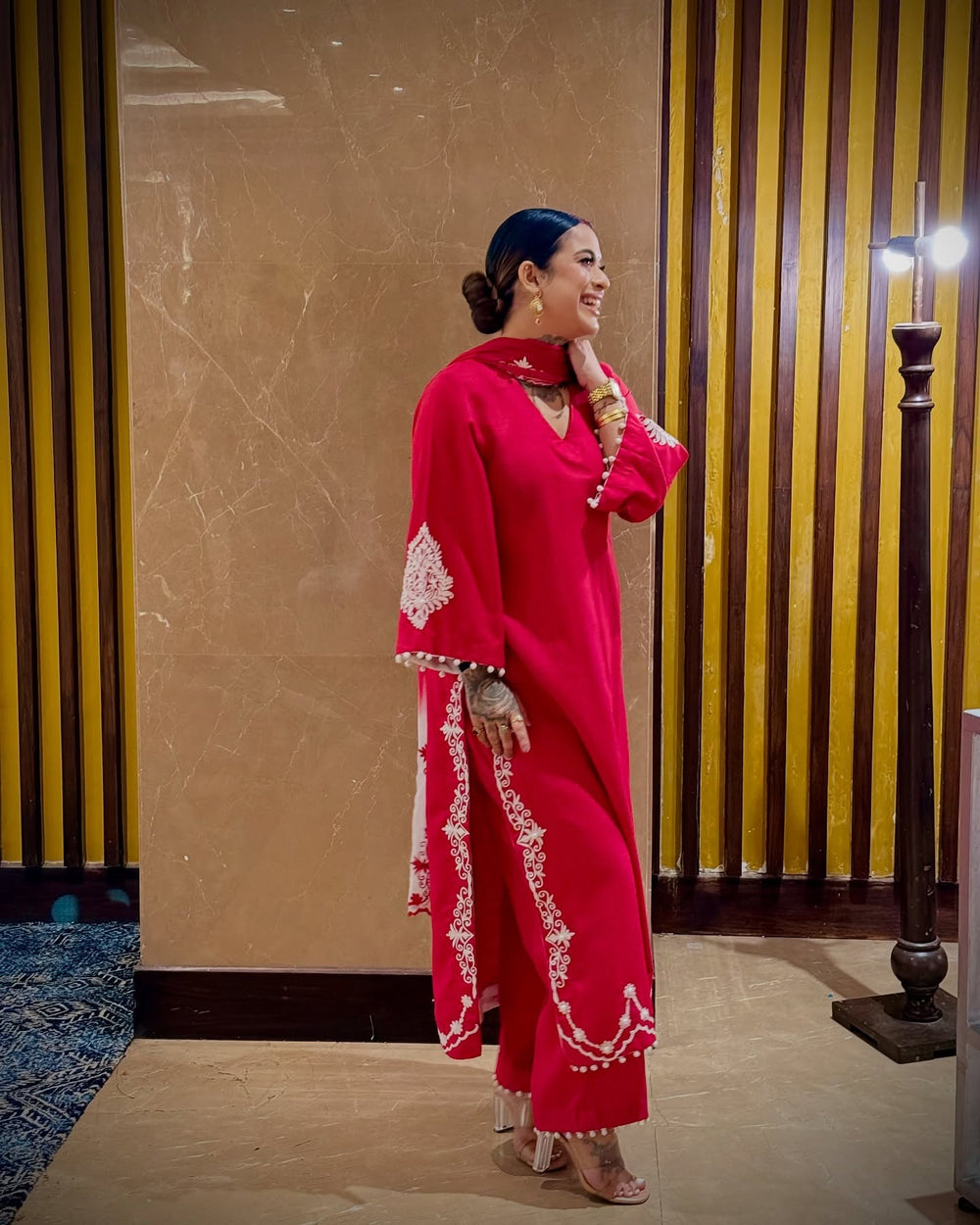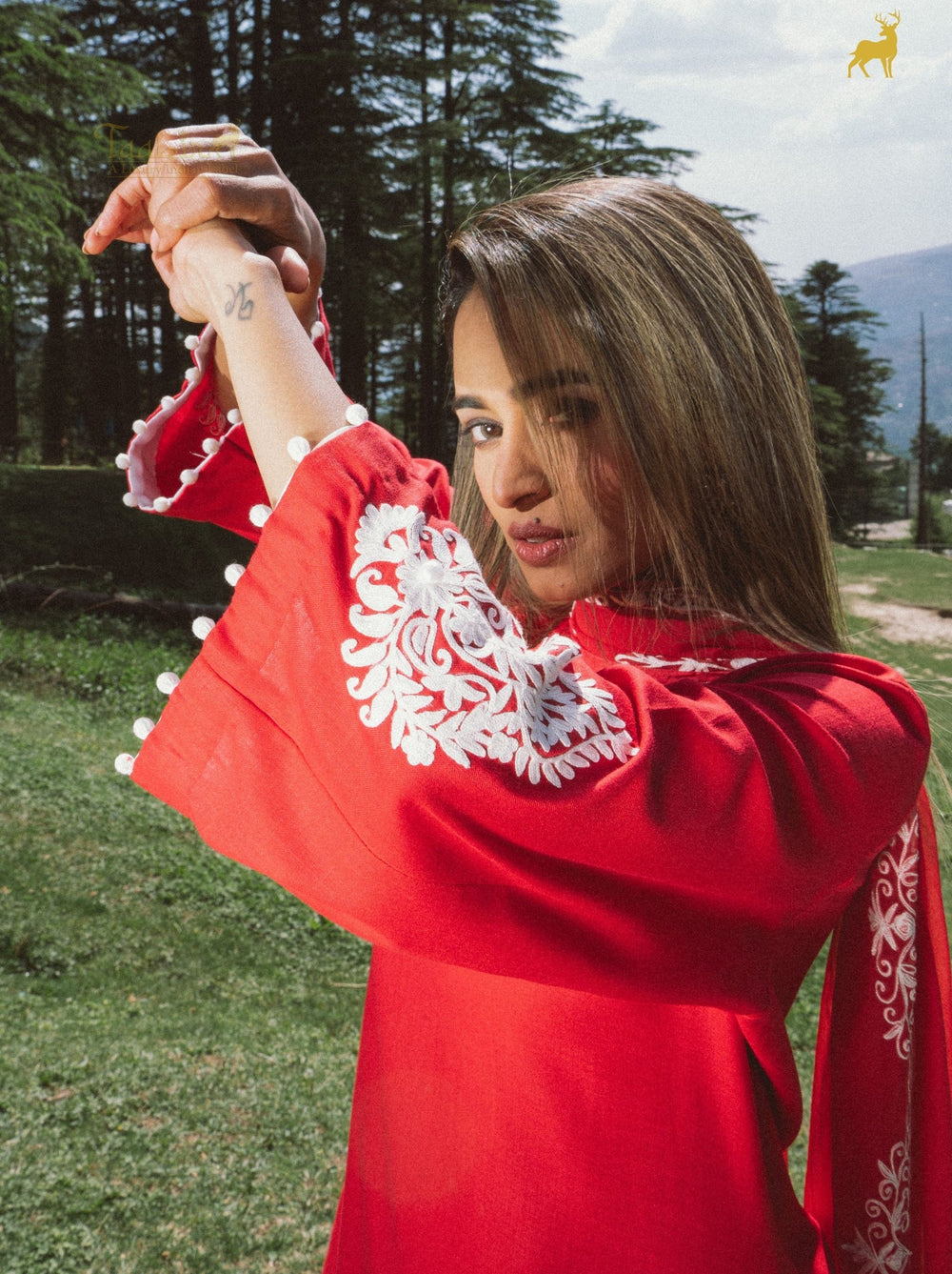 Make a bold statement with our Scarlet Radiance Suit Set, a masterpiece of vibrant color and delicate detail. This striking red kurta is crafted from premium fabric, featuring a elegant V-neckline and exquisite white floral embroidery cascading down the sides and adorning the cuffs. The design is elevated by playful pom-pom lace edging on the sleeves and hemline for a modern ethnic touch. The ensemble is paired with matching straight-fit trousers and a breezy, dual-toned red and white ombre dupatta. Perfect for festive celebrations or special evening events, this set seamlessly blends traditional charm with contemporary flair.