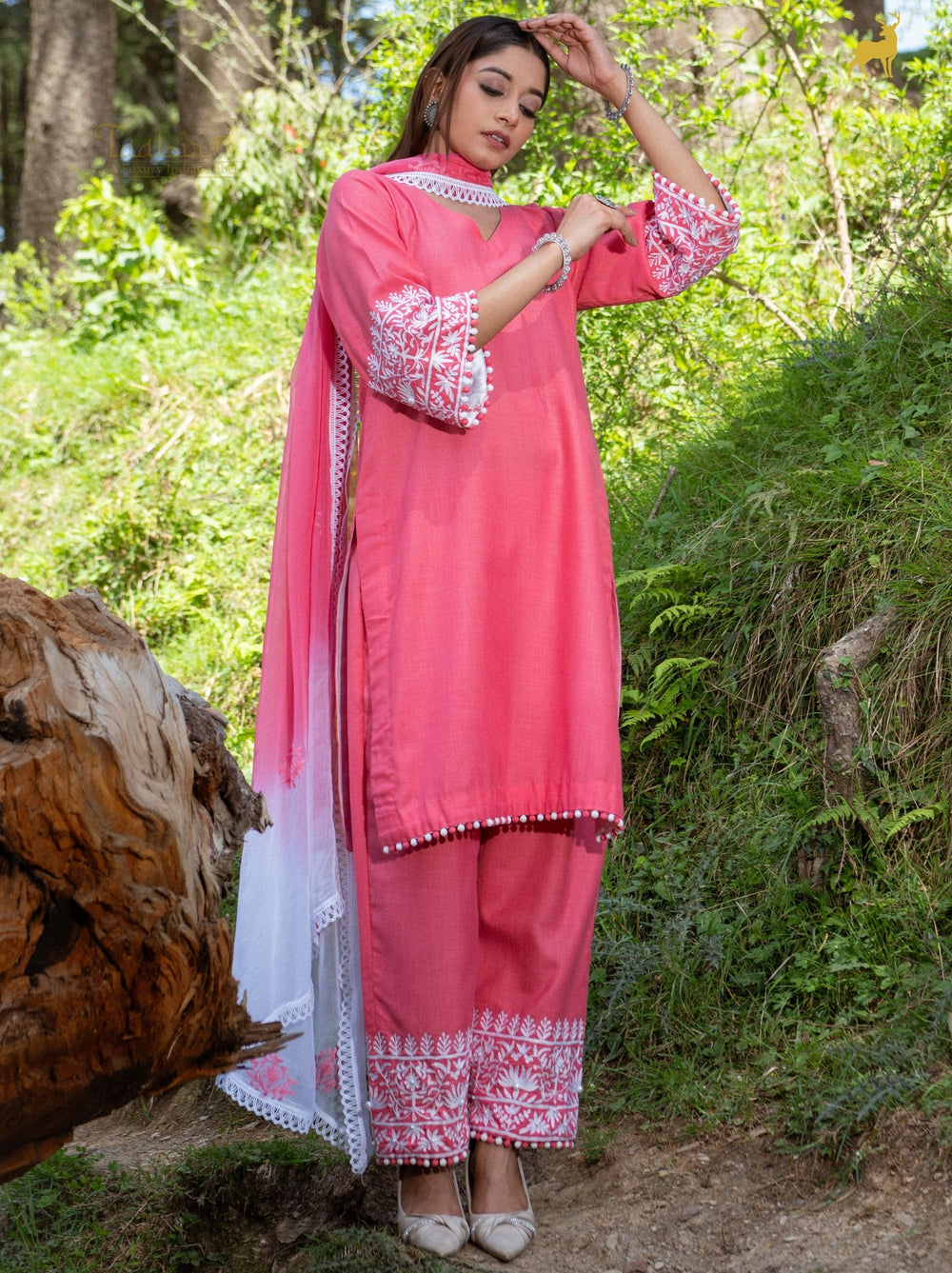 Elevate your ethnic wardrobe with our Sia Suit Set, a perfect blend of traditional craftsmanship and contemporary elegance. This stunning ensemble is crafted from premium Chanderi silk in a vibrant coral-pink hue, offering a subtle sheen and a luxurious drape. The straight-cut kurta features a classic V-neckline and bell-style sleeves adorned with intricate white Resham hand-embroidery and delicate pearl accents.